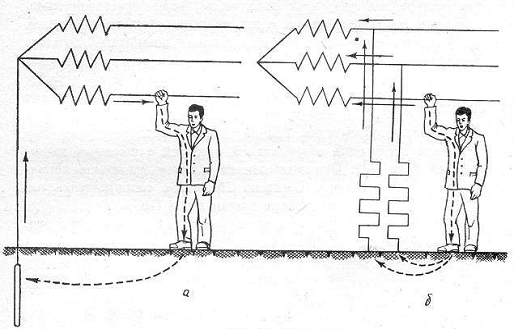прикосновения, возникающее при контакте человека с заземленной установкой, в
