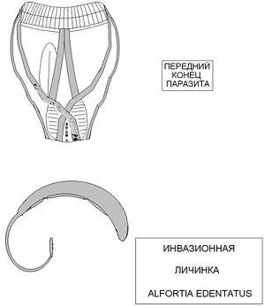 формируется личинка, которая разрывает оболочку, выходит во внешнюю среду, где