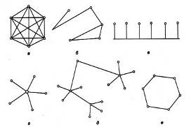 Рис. 2. Топологии: полная, не полная, шина, звезда, древовидная,