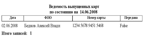ведомость выпущенных карт. Пример данного выходного документа показан на