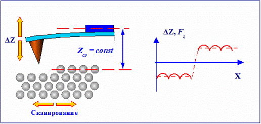 порядка 10 - 100 нм. Кантилевер подводится к поверхности так, чтобы в нижнем