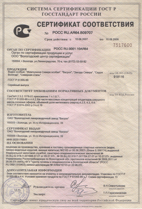 место - ОАО "Вологодский ЛВЗ "Вагрон" за водку