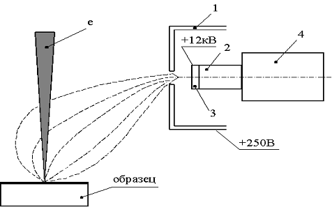 результате взаимодействия электронов 1 с образцом (веществом) 2 генерируются
