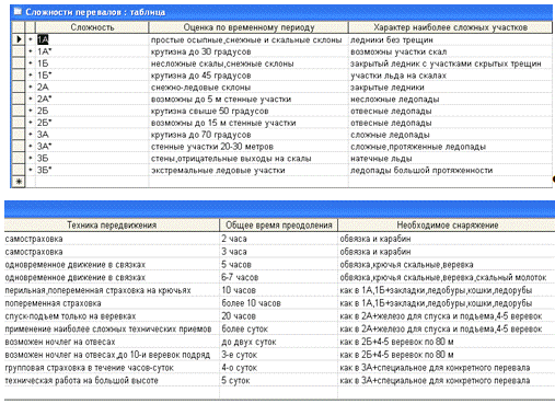 таблицы с информацией об горных районах, долинах, перевалах, категориях и
