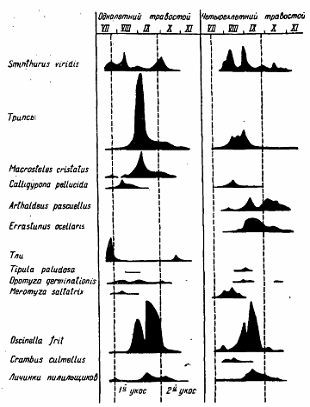 выделяются ногохвостки, трипсы, цикады, тли, галлицы и злаковые мушки. Правда,