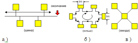 могут иметь топологию «шина» и «звезда». В первом случае все компьютеры