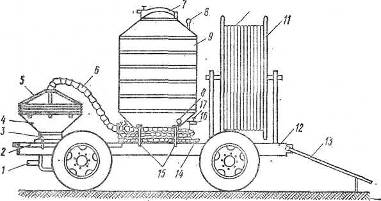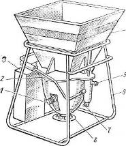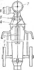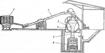 3 - бункер-накопитель; 4 - загрузочная воронка; 5 - брезентовый рукав; 6 -