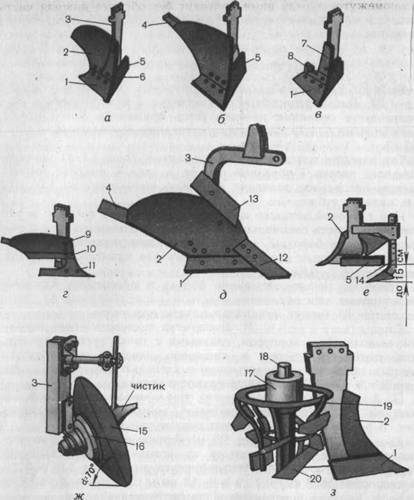 почвоуглубителем; ж - дисковый; з-комбинированный; 1, 10 и 11 - лемеха; 2 и 9-