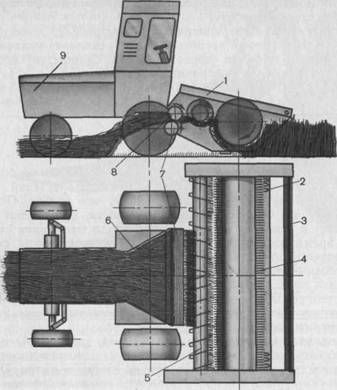 - шнек; 6 - валкообразующее устройство; 7 - нижний плющильный валец; 8 -