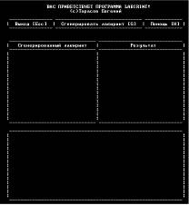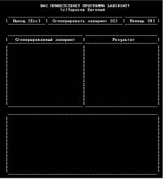 приветствие и три окна: для генерации лабиринта, для комментария событий и для