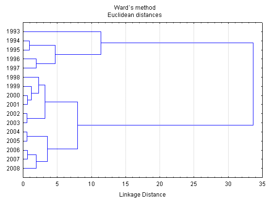 промежуток времени, и при анализе дендрограмм были выявлены группы схожих