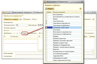 один тип приказа, как показано на рисунке выше. С помощью кнопки «Подбор» можно