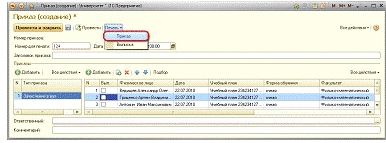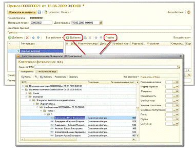 воспользоваться кнопкой «Подбор», которая позволяет добавить в приказ