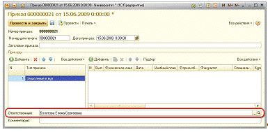 Для каждого приказа может быть назначен ответственный за его исполнение.