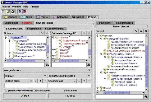 целью создания одной новой (PROMPT, Chimaera, OntoMerge);