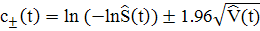 on(a2,sigma)(1)=[];=(t1)./(log(s).^2);=log(-log(s))-1.96.*sqrt(v);=log(-log(s))+1.96.*sqrt(v);