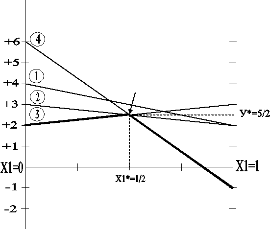 от х1. Максимин достигается при х1*=1/2. В этой точке пересекаются любые две из