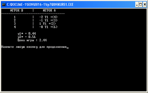 (х1*=1/2, х2*=1/2) и значение игры находится подстановкой х1 в уравнение любой