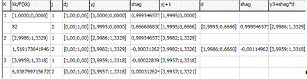 do.StringGrid1.Cells[o,s]:='';:=0;.StringGrid1.RowCount:=10;:=2;.one:=StrToFloat(Form1.Edit2.Text);.two:=StrToFloat(Form1.Edit3.Text);:=StrToFloat(Form1.Edit4.Text);:=1;.stringgrid1.Cells[0,0]:='K';.stringgrid1.Cells[1,0]:='Xk/F(Xk)';.stringgrid1.Cells[2,0]:='j';.stringgrid1.Cells[3,0]:='dj';.stringgrid1.Cells[4,0]:='yj';.stringgrid1.Cells[5,0]:='shag';.stringgrid1.Cells[6,0]:='yj+1';.stringgrid1.Cells[7,0]:='d';.stringgrid1.Cells[8,0]:='shag';.stringgrid1.Cells[9,0]:='y3+shag*d';;