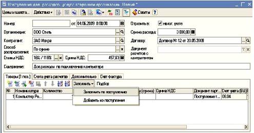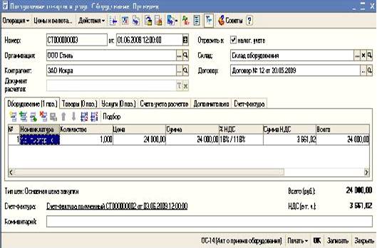 Сохраняем документ. Сразу же вводим счет-фактуру