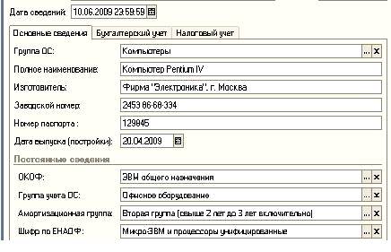 название актива; счета учета (заполняются автоматически; способ отражения
