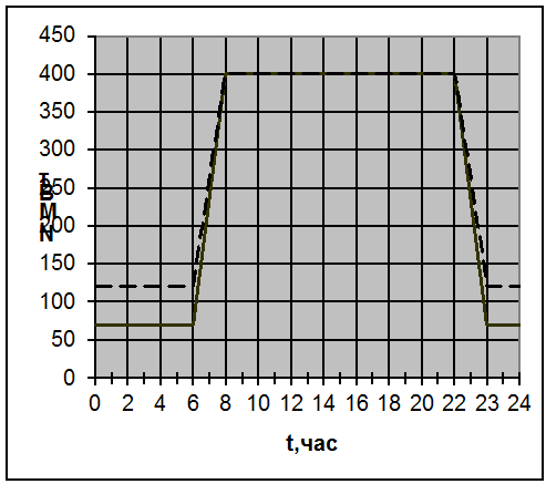 линия - график нагрузки при ночном провале 70 МВт; штриховая линия - график