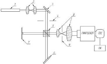 4, плоским зеркалом 5 и юстировочным зеркалом 8. В одном из плеч интерферометра