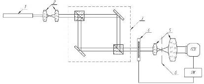 Излучение Не-Nе-лазера 1 (l = 0,633 мкм) расширялось телескопом 3 и коллиматором 3 и