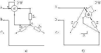 измеряют тремя ваттметрами (рис. 7), каждый из которых измеряет мощность одной