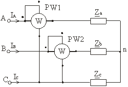 На рис.10 показана одна из возможных схем включения ваттметров: здесь