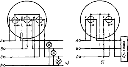 Трехэлементные счетчики (рис. 12, а) используют в четырехпроводных цепях