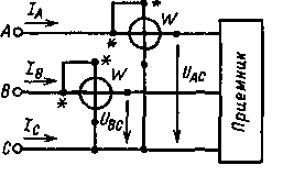 а катушки напряжения - соответственно на линейные напряжения UAC и UBC.