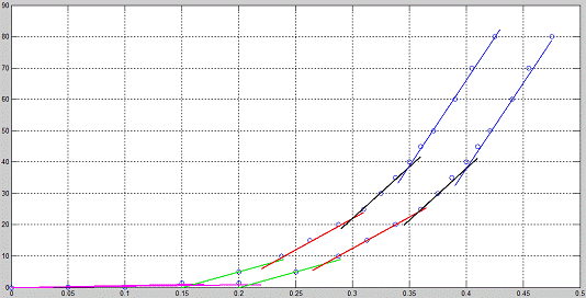из библиотеки Simscape. Снять ВАХ, построить графики зависимости тока от напряжения.