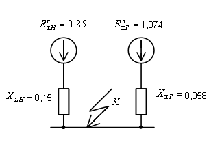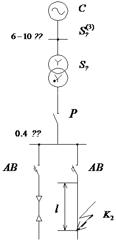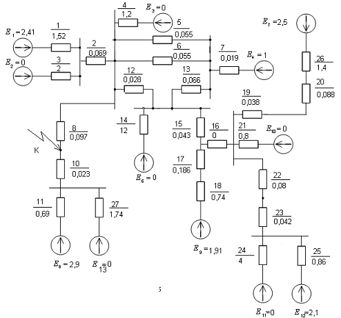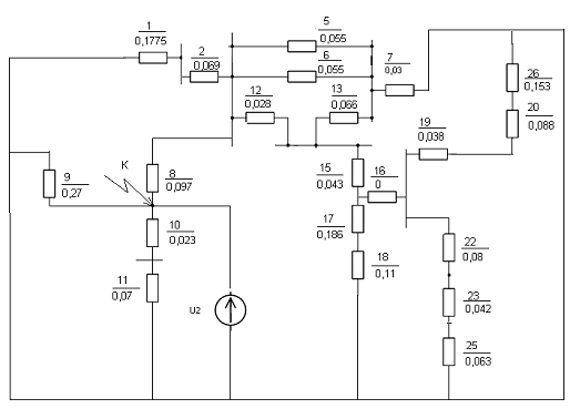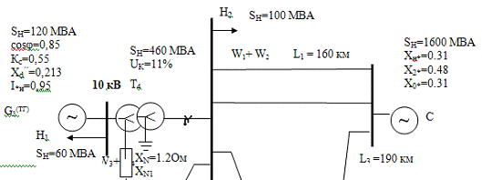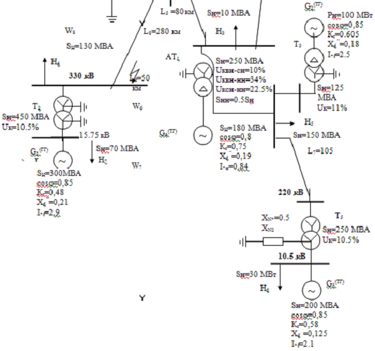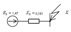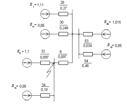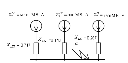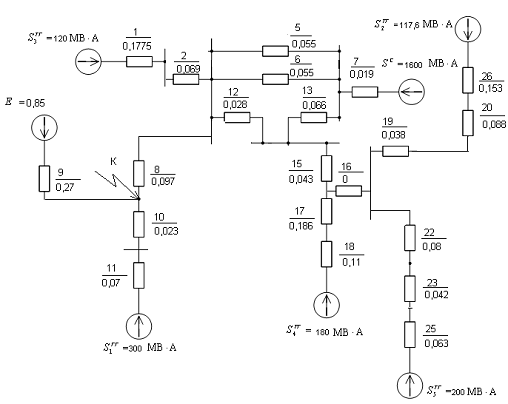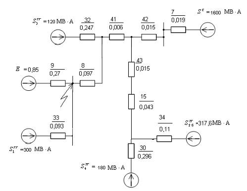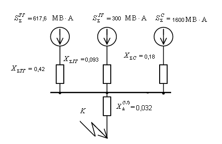 электрической системы с указанием места трехфазного короткого замыкания. Расчет