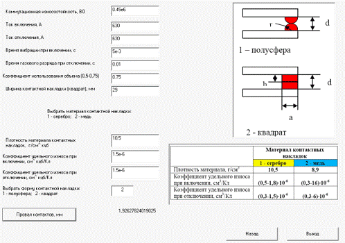 Рис. 3. Расчет размеров контактной пластины в программе