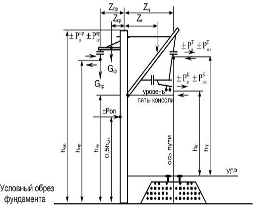 h - высота опоры, м; hпт - высота пяты консоли, м; zп - габарит подвески, м; zкон - длина плеча нагрузки консоли, м; zкр - длина плеча