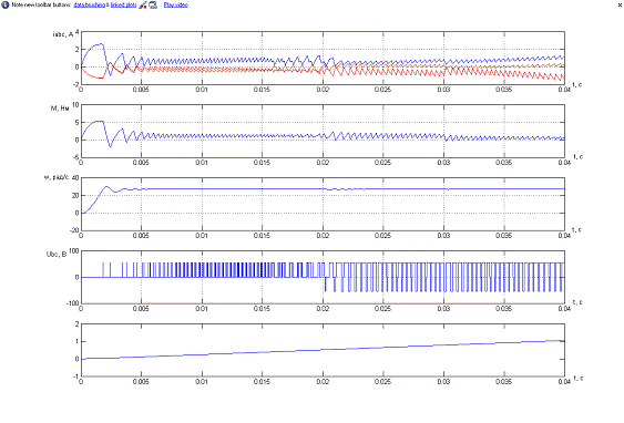 формы тока двигателя, момента, скорости, а также график углового перемещения.
