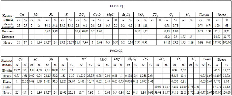Выход основных продуктов составил: штейна - 31,62%, шлака - 32,72%. При этом