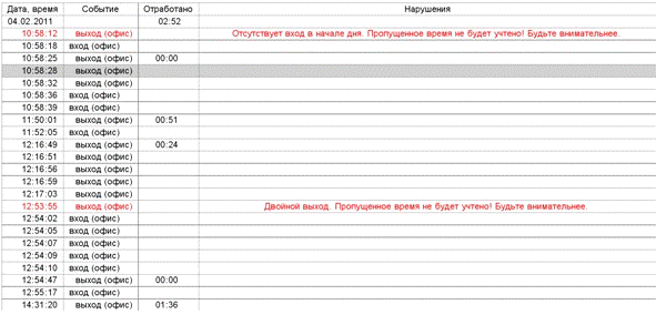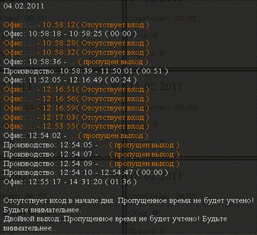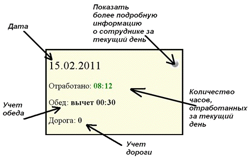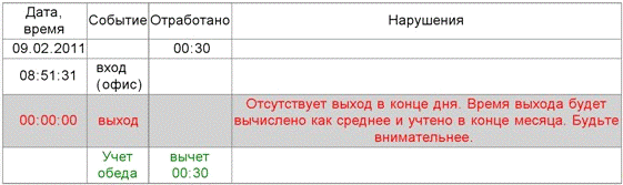 часы:минуты). Отображается зеленным, если у сотрудника за текущий день не было