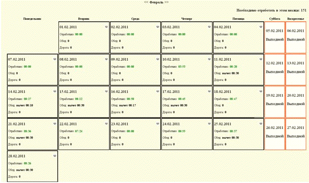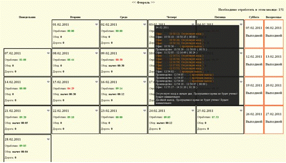 предусмотрена возможность просмотра всего рабочего месяца в виде календаря. Для