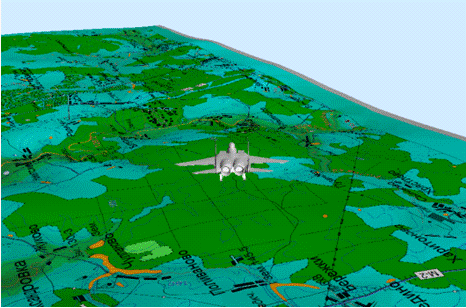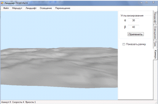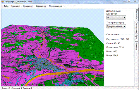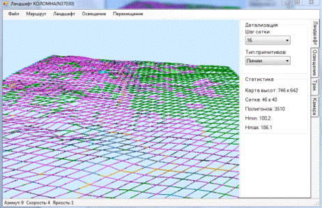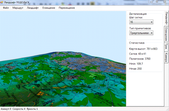 обеспечивает возможность построения 3D ландшафта местности по цифровой карте, загруженной из файла, имитации