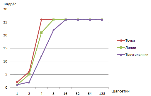 наблюдается резкое падение частоты кадров (8 - для примитива «треугольники», 4