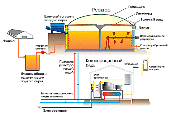 получения биогаза. Органические стоки, обычно жидкий навоз, поступают в