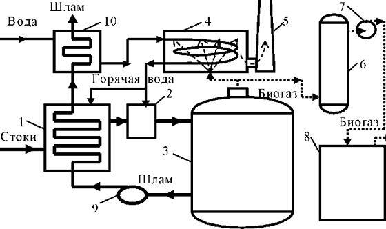 метантенке 3, частично сжигается в нагревателе воды 4, и продукты горения