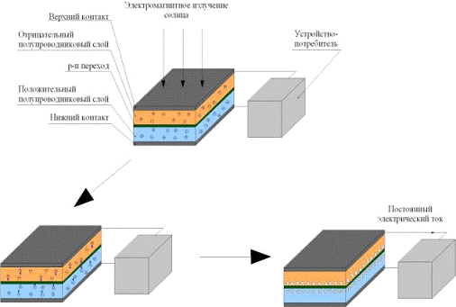 фотоны, и их энергия преобразуется в электрическую посредством p-n