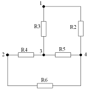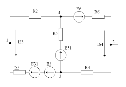 источниками ЭДС и задаем произвольно направление токов, пронумеровав узлы