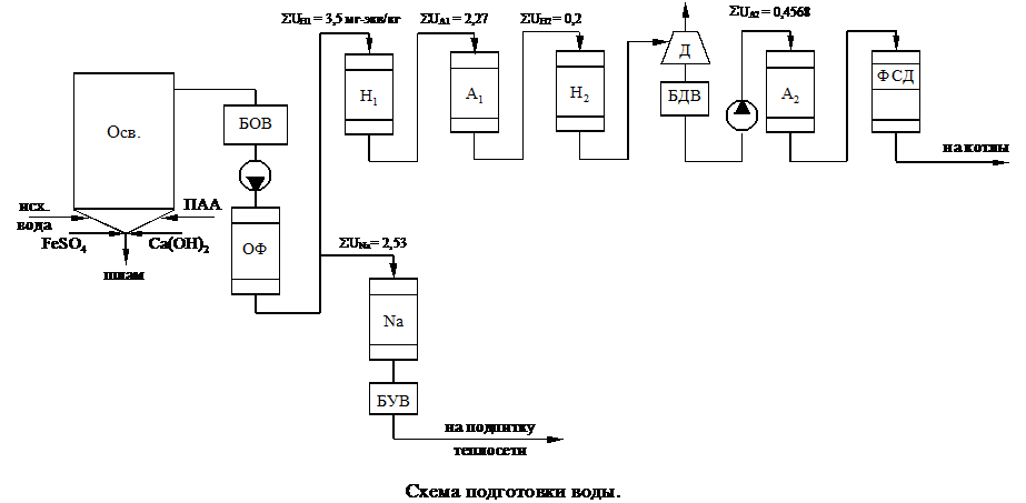 схеме предочистка на ВПУ проводится коагуляцией FeSO4 с известкованием Ca(OH)2.
