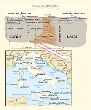 синхронизации и карта, на которой показаны расположение ЦЕРН, Гран-Сассо и