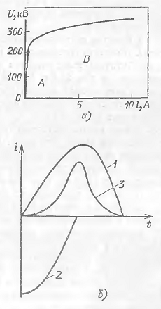 (кривая 3). Во время пробоя через разрядник протекает импульс тока.