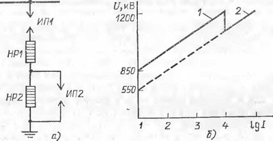 (кривая 2). При появлении перенапряжения промежуток должен пробиться раньше,
